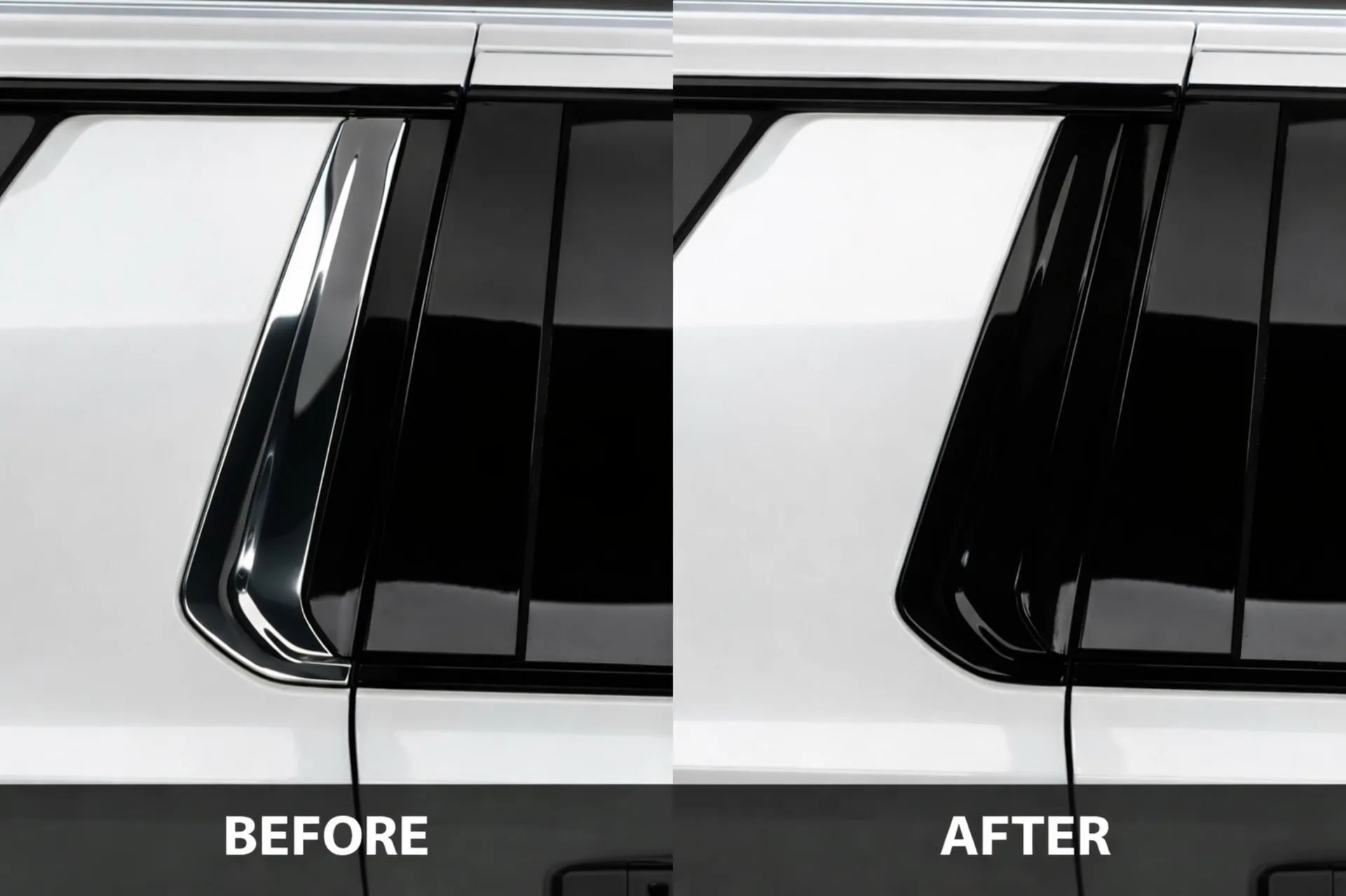 Vinyl wrap applied to chrome trim pieces like window moldings, door handles, and grille accents to give your vehicle a modern, blacked-out appearance. Available in gloss black, satin black, matte black, or custom colors to match your style.